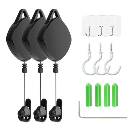 Haki wystarczy przykleić na płytkach pokrytych mocnym klejem. Haki na samoprzylepnych, przeźroczystych płytkach bardzo dobrze trzymają się sufitu i nie zwracają na siebie zbędnej uwagi. Regulacja długości wysuwania się kabla za pomocą ogranicznika zamontowanego pod gumową osłoną na lince. Drugim sposobem na zamontowanie haków jest użycie kołków dołączonych do zestawu, po osadzeniu ich w suficie wystarczy wkręcić w nie haki.